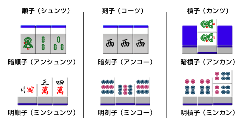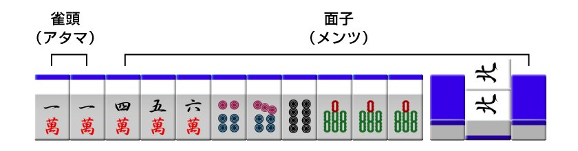 - 2枚1組の雀頭(アタマ)と、3枚(または4枚)ずつ4組の面子(メンツ)の組み合わせ(一部例外あり)をいかに早く作る(和了する/上がる)かを競うゲームです。