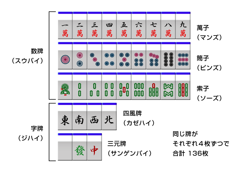 - 2枚1組の雀頭(アタマ)と、3枚(または4枚)ずつ4組の面子(メンツ)の組み合わせ(一部例外あり)をいかに早く作る(和了する/上がる)かを競うゲームです。